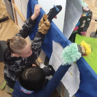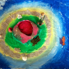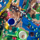 Die Kitakinder reisen mit fantastischen Geschichten um die ganze Welt. Sie begleiten den kleinen Zauberer, den Buckelwal, den Drachen Kokosnuss oder Janoschs Tiger auf ihren Reisen, erleben mit ihnen Abenteuer und setzen diese in verschiedenen künstlerischen Techniken um. Beim gemeinsamen kreativen Arbeiten entstehen sowohl ganz persönliche Werke als auch ausdrucksvolle Gemeinschaftsarbeiten. Die Kinder bekommen einen besonderen Zugang zu Kunst und Literatur und erleben eine große Eigentätigkeit und Wertschätzung. (Leitung: Verena Klary und Daphne Noee, Eva Wittig und Christine Lutz, Koordination: Ina Weiß, gefördert von "Wir können Kunst" im Rahmen von "Kultur macht stark - Bündnisse für Bildung")