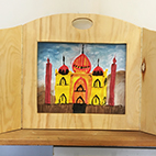 Prächtige Gotteshäuser aus Styropor, die typische Elemente unterschiedlicher Religionen und Bautraditionen in sich vereinen, empfangen die Besucher in der Kindermalwerkstatt Kind & Kunst. Auch die Collagen an den Wänden zeigen eine bunte Mischung aus orthodoxen Goldkuppeln, Säulen griechischer Tempel, gotischen Kirchtürmen und filigranen Minaretten; und das nicht nach religiösen Kontext getrennt sondern nach persönlichem Geschmack in jedem Bild neu komponiert. Daneben hängen vergoldete Materialbilder und lichtdurchflutete Gebilde aus Farbfolien als Ausdruck des Göttlichen; ob man die Werke einfach schön findet oder den Bezug zu mittelalterlicher Farb- und Lichtsymbolik herstellt, bleibt dem Betrachter überlassen. Geheimnisvolle Objekte stehen fü,r das verborgene Wirken Gottes, während Farbexperimente das Chaos als Ursprung alles Lebendigen symbolisieren. Aspekte wie die Begegnung in der Gemeinschaft oder im Gegenüber finden in großformatigen Gemeinschaftsbildern ihren Ausdruck. Abgerundet wird die Ausstellung durch Trickfilme, die sich mit der Suche des Menschen nach Gott auseinandersetzen