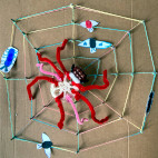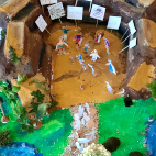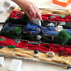 Dabei arbeiten die Kinder ganz frei ohne Anleitung, die Erwachsenen sind nur stille Beobachter*innen. Alle Kleingruppen erhalten wabenförmige Grundplatten, auf denen sie mit Baumaterialien (Holz, Draht, Pappe, Textil- und Naturmaterialien) und Farben ihre Welt entstehen lassen. Als Stadt- und Landschaftsplaner*innen kleben, malen und bauen die Schüler*innen und nach und nach wächst eine komplexe Welt heran. Dabei werden immer wieder Kompromisse erarbeitet, um allen Baumeister*innen gerecht zu werden. Am Ende werden alle Einzelwelten zu einer großen Welt vereint. (Leitung: Ina Weiß, gefördert vom Kulturbüro der Stadt Karlsruhe, im Rahmen des 24 Stunden-Laufs des stja und vom Landesverband der Jugendkunstschulen Baden-Württemberg)