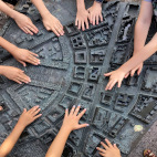 Dabei arbeiten die Kinder ganz frei ohne Anleitung, die Erwachsenen sind nur stille Beobachter*innen. Alle Kleingruppen erhalten wabenförmige Grundplatten, auf denen sie mit Baumaterialien (Holz, Draht, Pappe, Textil- und Naturmaterialien) und Farben ihre Welt entstehen lassen. Als Stadt- und Landschaftsplaner*innen kleben, malen und bauen die Schüler*innen und nach und nach wächst eine komplexe Welt heran. Dabei werden immer wieder Kompromisse erarbeitet, um allen Baumeister*innen gerecht zu werden. Am Ende werden alle Einzelwelten zu einer großen Welt vereint. (Leitung: Ina Weiß, gefördert vom Kulturbüro der Stadt Karlsruhe, im Rahmen des 24 Stunden-Laufs des stja und vom Landesverband der Jugendkunstschulen Baden-Württemberg)