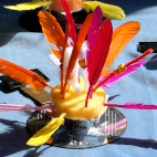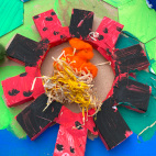 Im Laufe der vier Tage sind große bunte Bali-Fahnen entstanden, die die Besucher am Eingang des KIX-/Zirkusgeländes empfingen. Dazu wurden Muster und Motive entworfen und viele kleine kleine Wimpel gestaltet, die das Zirkuszelt schmücken. (Leitung: Ina Weiß im Kooperation mit den Mobilen Spielaktion Karlsruhe)